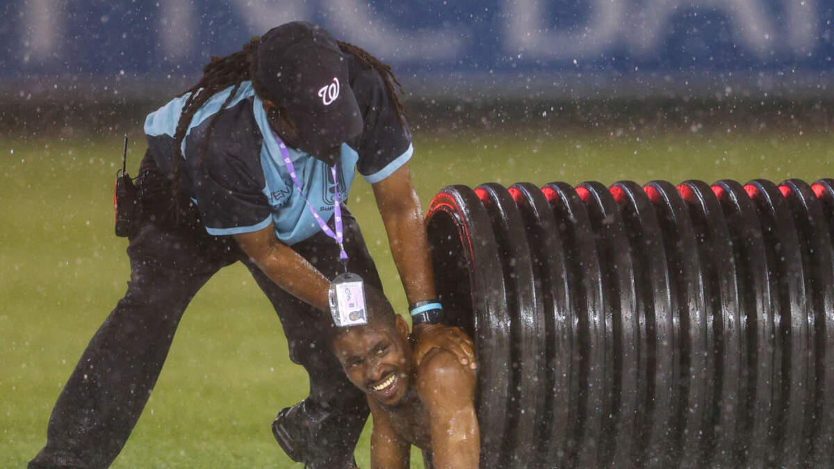 A man at the Washington Nationals game had the brilliant idea to run on the field naked during a rain delay. As you can see in the videos he was untouched for quite some time before making it on the tarp and sliding into the tarp roller. We've seen quite a few streakers and people running on the field, but this guy really got his moment.